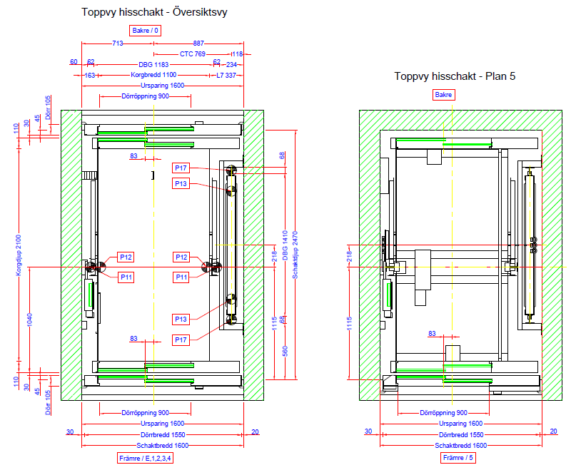 Hissmått Nedan bild visar måtten på hissen i huset. Viktiga mått: Dörröppning 900 mm Korgbredd 1100 mm Korgdjup 2100 mm